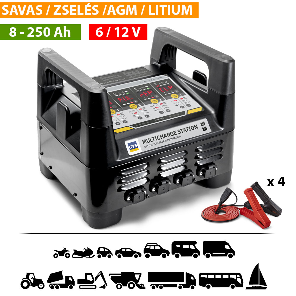 A 4 x 10 A - Pb/Li többszörös töltőállomást mikroprocesszor vezérli, amely garantálja a hatékonyságot és a biztonságot. Intelligens, automatikus töltési görbéje maximalizálja az akkumulátor élettartamát és teljesítményét.